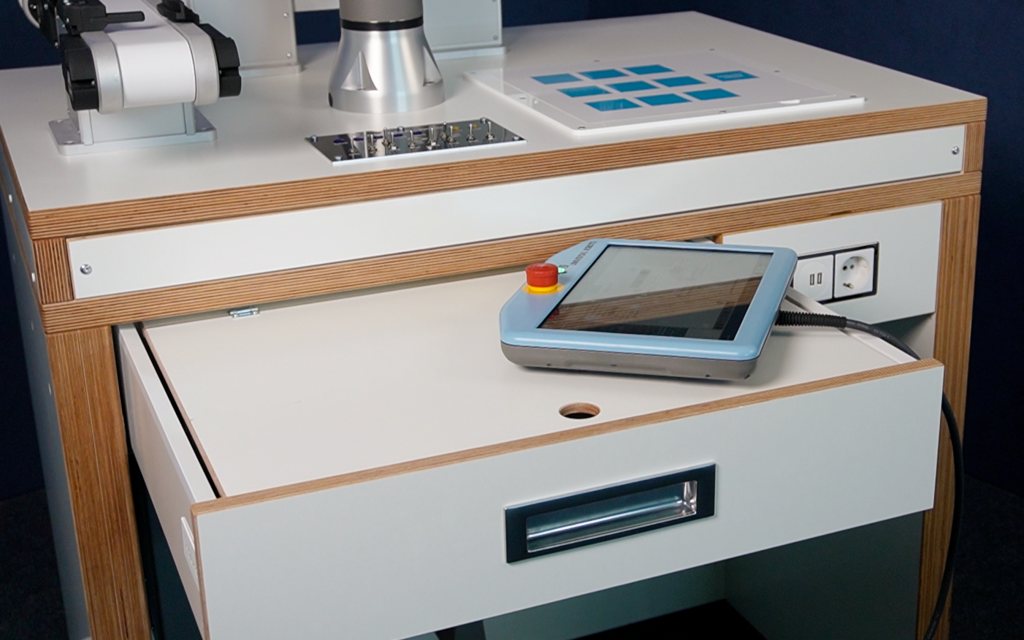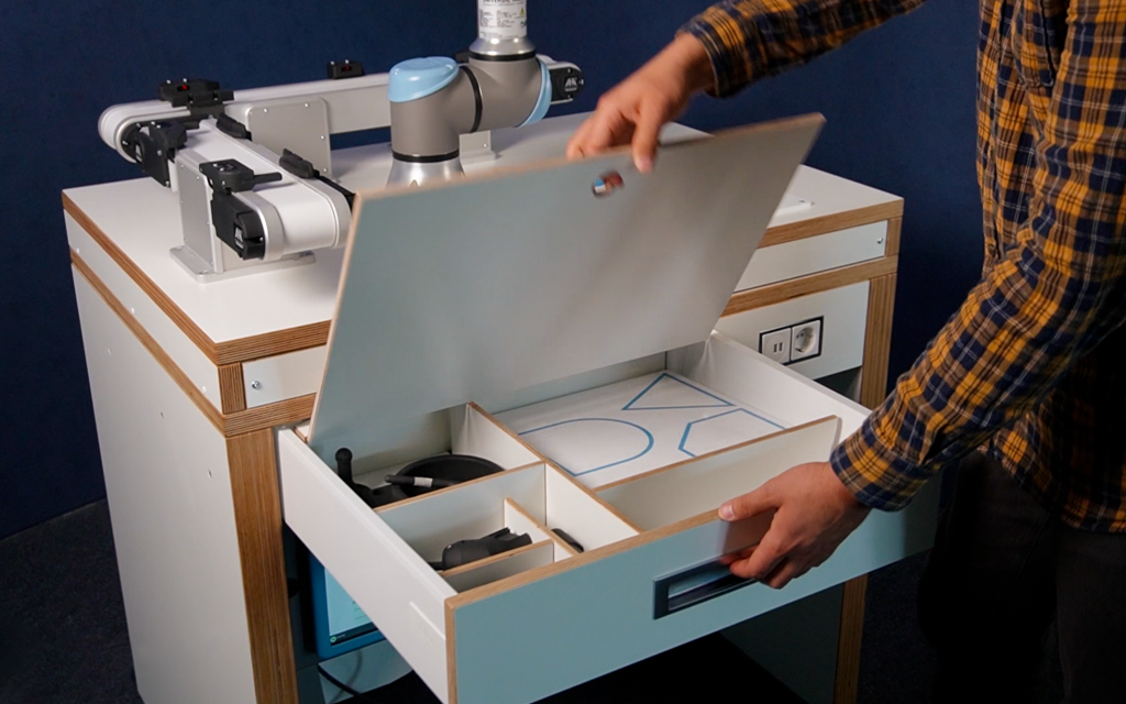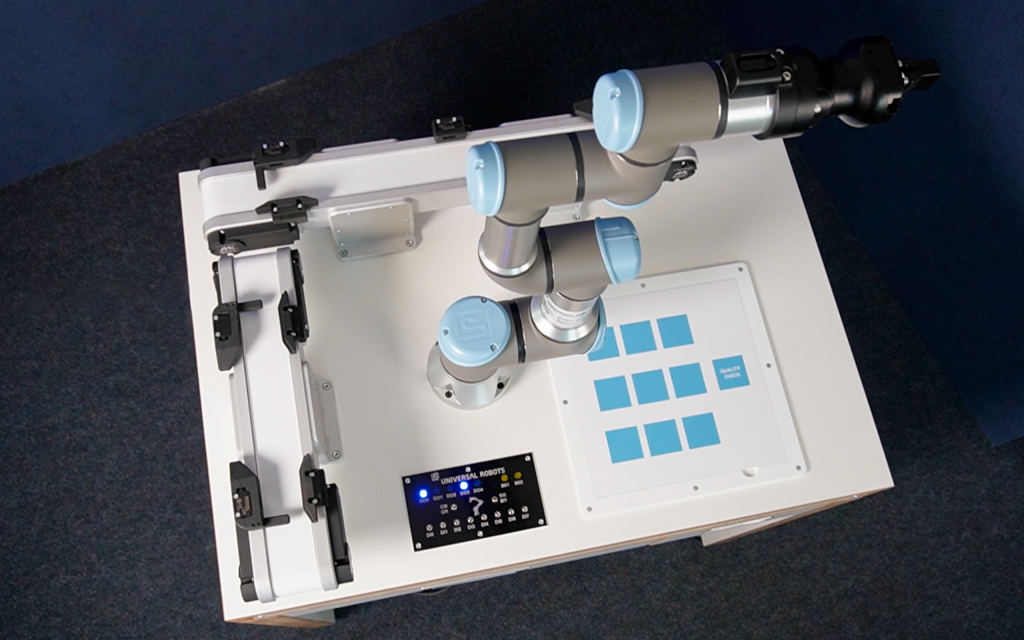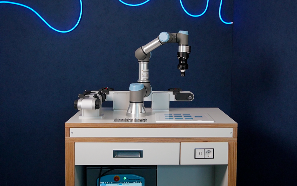 Unsere Schulungszelle für Universal Robots ist die ideale Wahl für Unternehmen, Berufsschulen und Ausbildungszentren, die ihre Mitarbeiter, Schüler oder Auszubildenden im Umgang mit Cobots schulen möchten. Der CoboLearnTable überzeugt nicht nur durch das elegante Design, sondern ist auch äußerst robust und widerstandsfähig.
