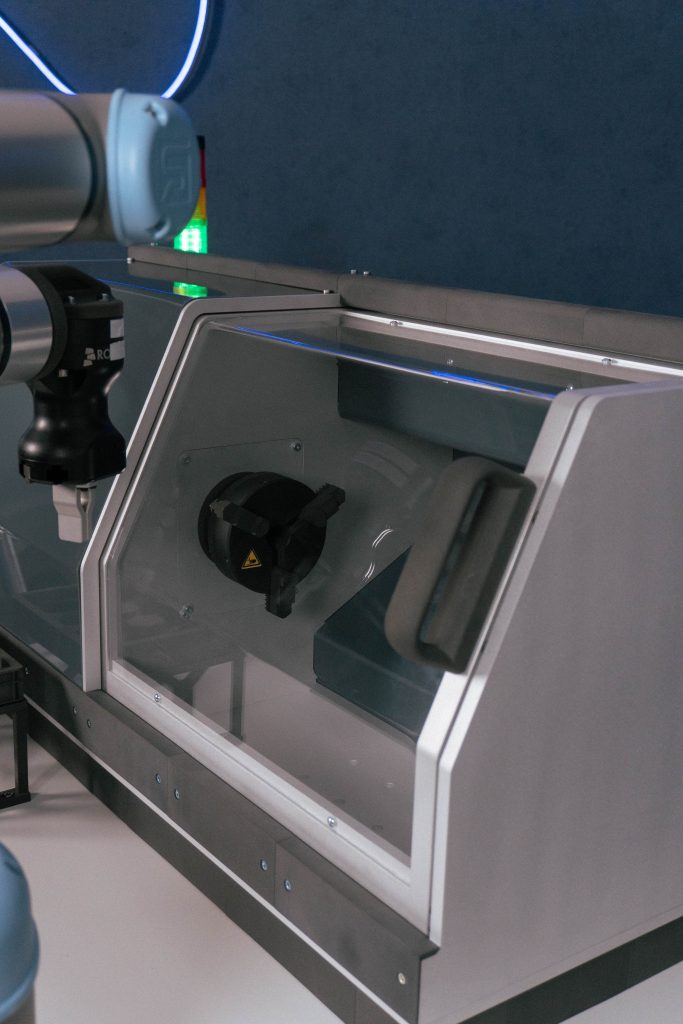 Dank automatischer Tür und automatischem Dreibackenfutter lassen sich industrielle Anwendungen realitätsnah simulieren.